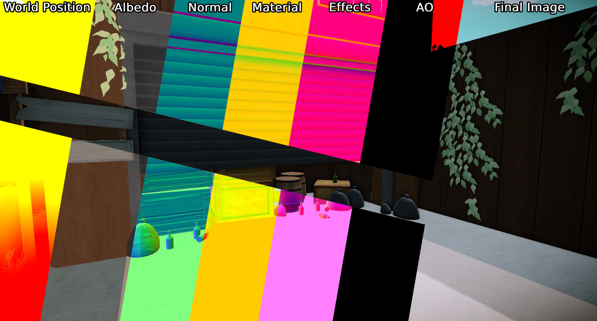 During the second project with the engine we wanted to go from a forward renderer to a deferred renderer, so together with Anton Eriksson I took on this task. Deferred rendering is a technique that dissects the data to be rendered and writes what data should be used per pixel to different textures, instead of forward rendering that renders all objects as you would create a stop motion movie with paper figures. Another huge difference from forward rendering is that instead of running expensive shader code on objects that will later be occluded by something in front, we just run the expensive shaders later when we have determined what data is to be used on that pixel.In our deferred renderer we chose to extract the following data from our rendered models: World Position, Albedo, Texture Normal, Material, Ambient Occlusion and lastly Effects. Although the world position texture can be seen as redundant as we could just as easily calculate the world position in the shader, we agreed that it has its benefits to keep the texture. These textures are saved in an object called GBuffer that acts as a texture container for the Deferred Renderer. When all models have been rendered we are left with several textures that contain their relevant data, now its just up to something to put them all together.